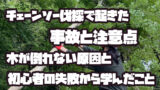 コツはレバーホイストで引っ張りながら追い口に切れ目を入れていくと、伐倒方向に自然に倒れていくよ。